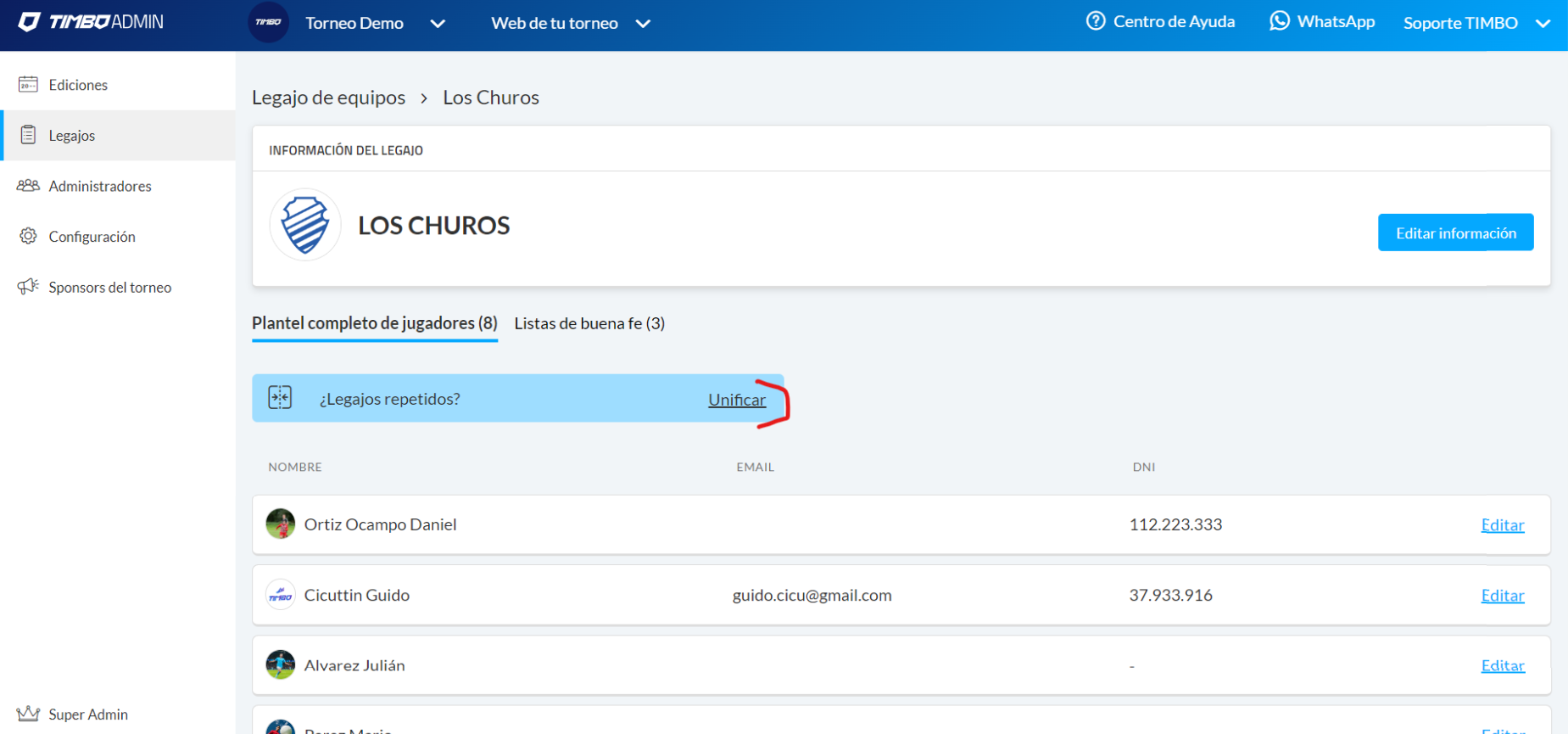 Si detectas legajos de jugadores repetidos, tenés la posibilidad de unificarlos para corregirlo. Esta metodología aplica tanto para equipos como jugadores.
